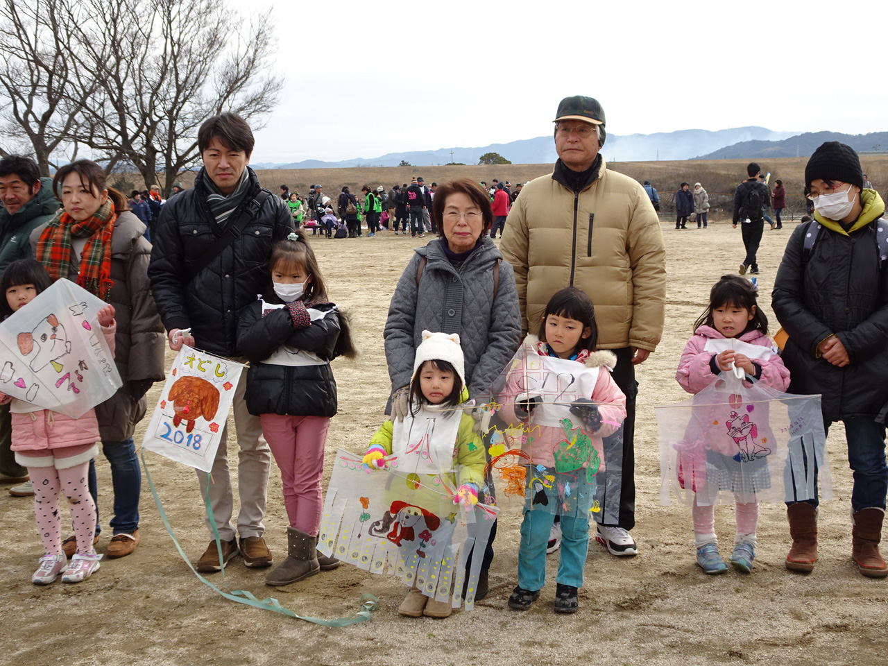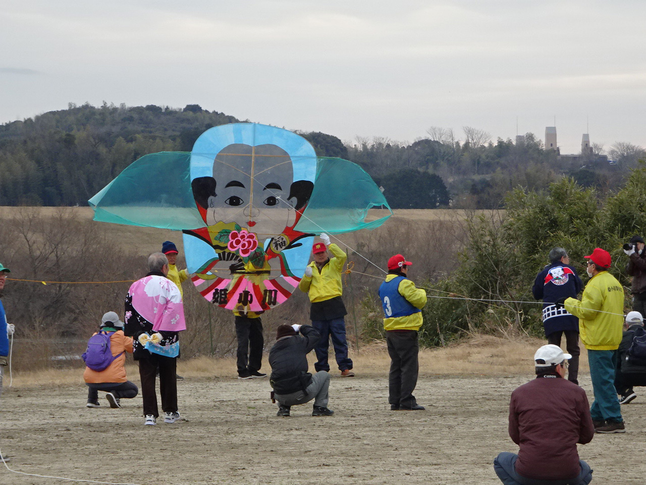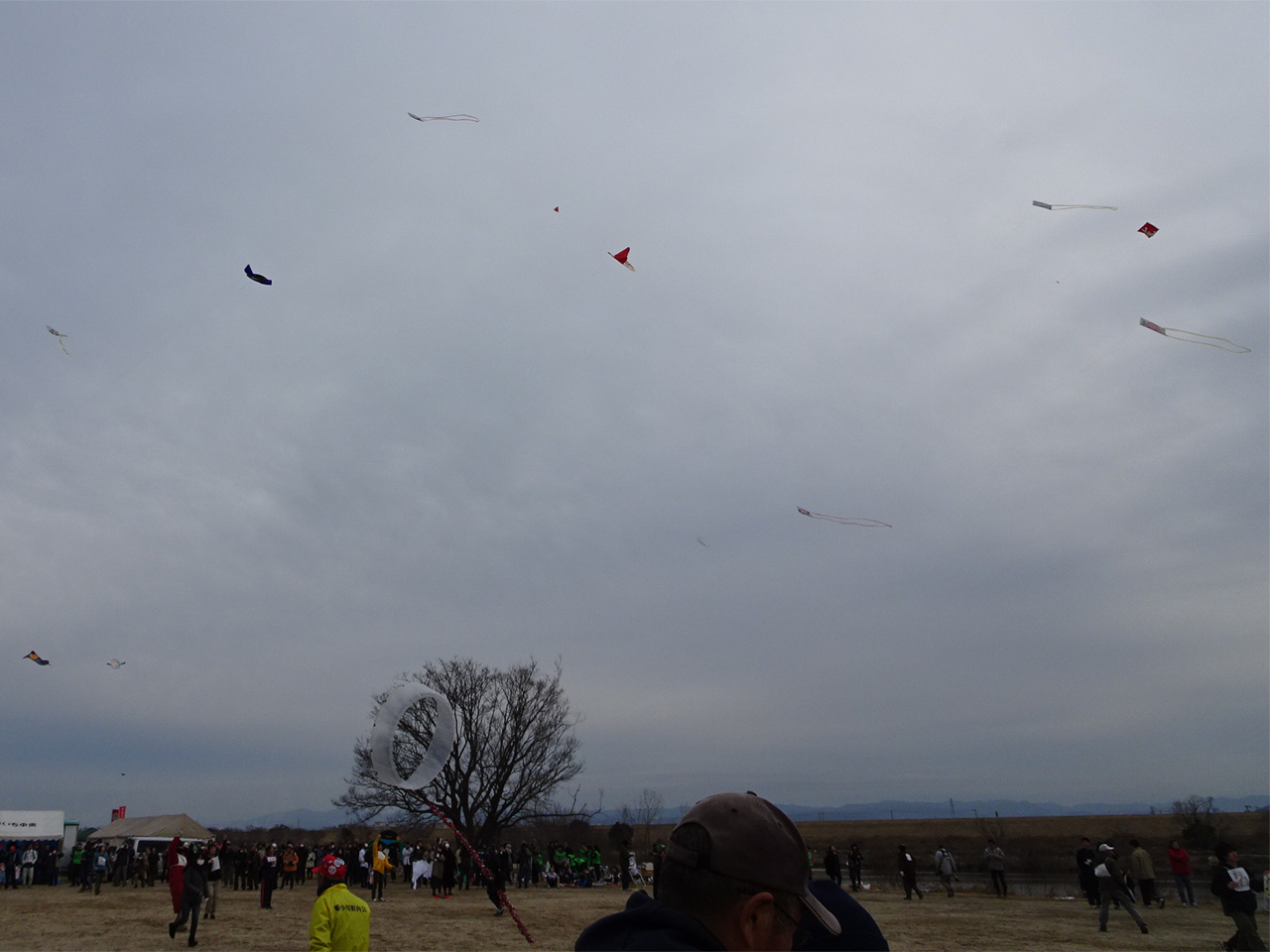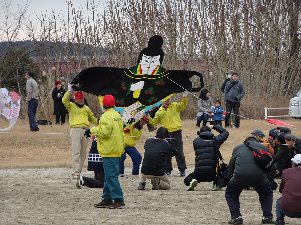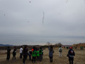 そして、一般の部の大会。霜柱のため限られた狭い場所での凧揚げとなりました。 | ||||||
