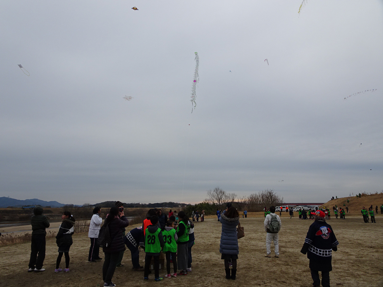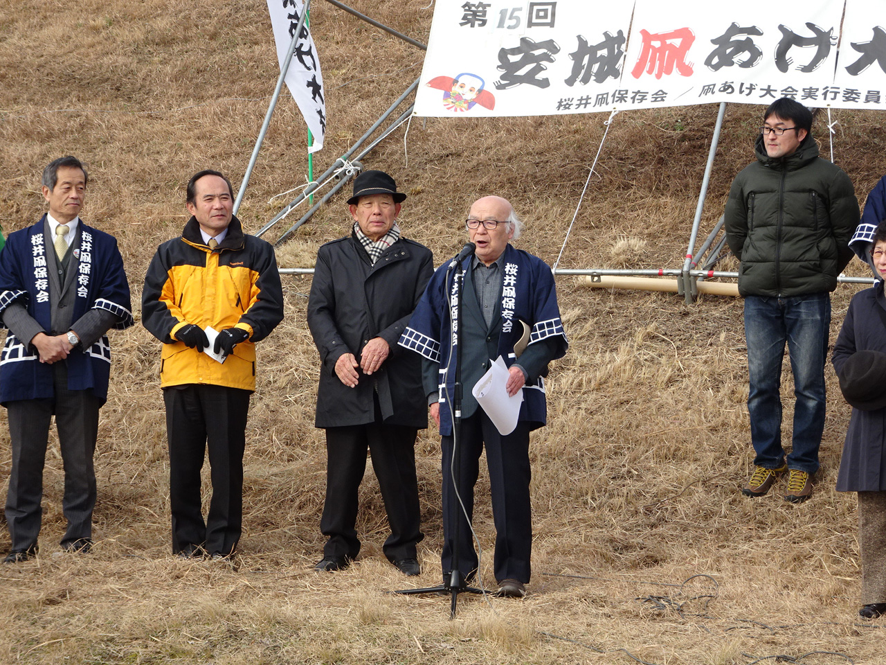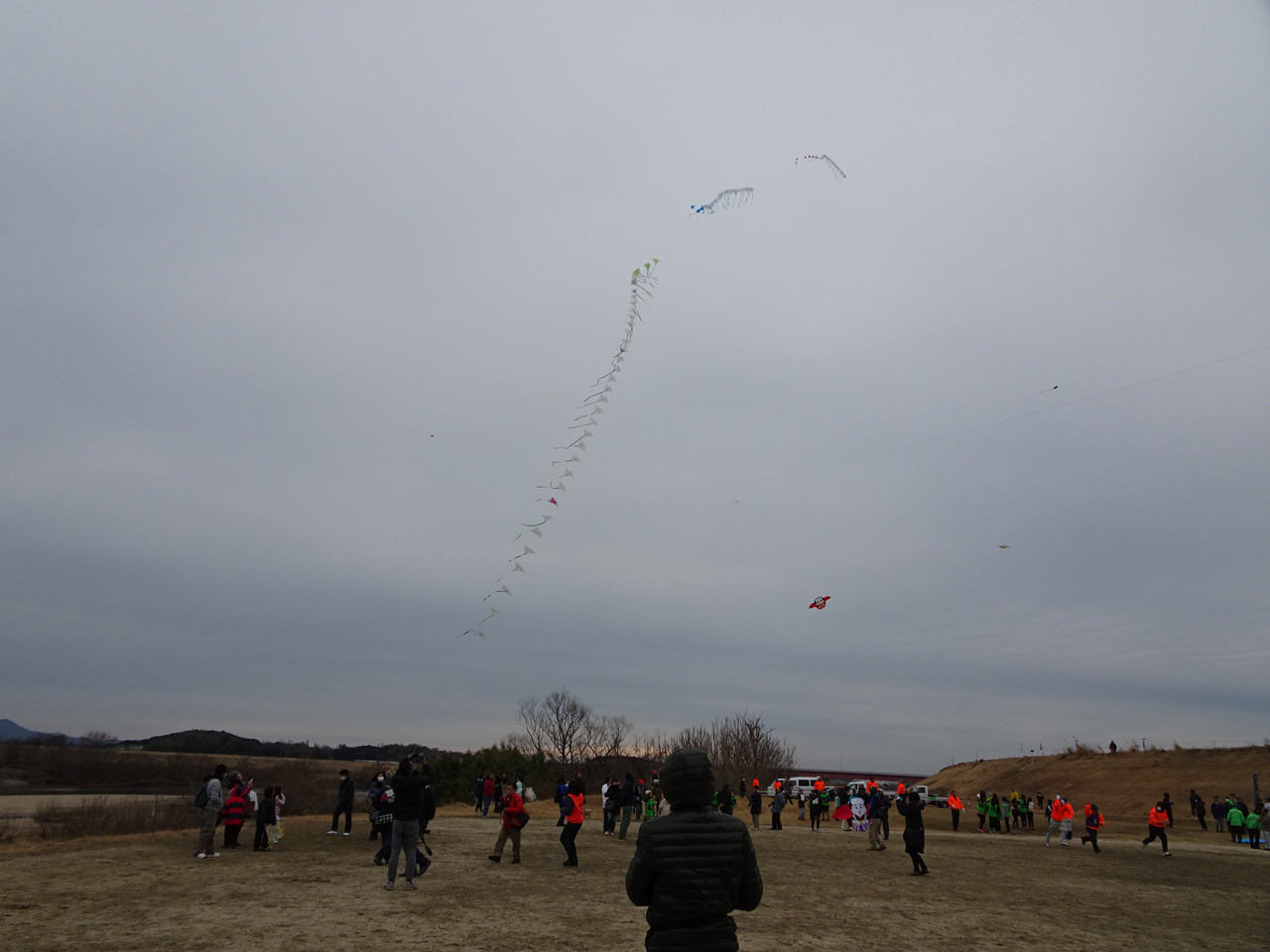 そして、一般の部の大会。霜柱のため限られた狭い場所での凧揚げとなりました。 | ||||||