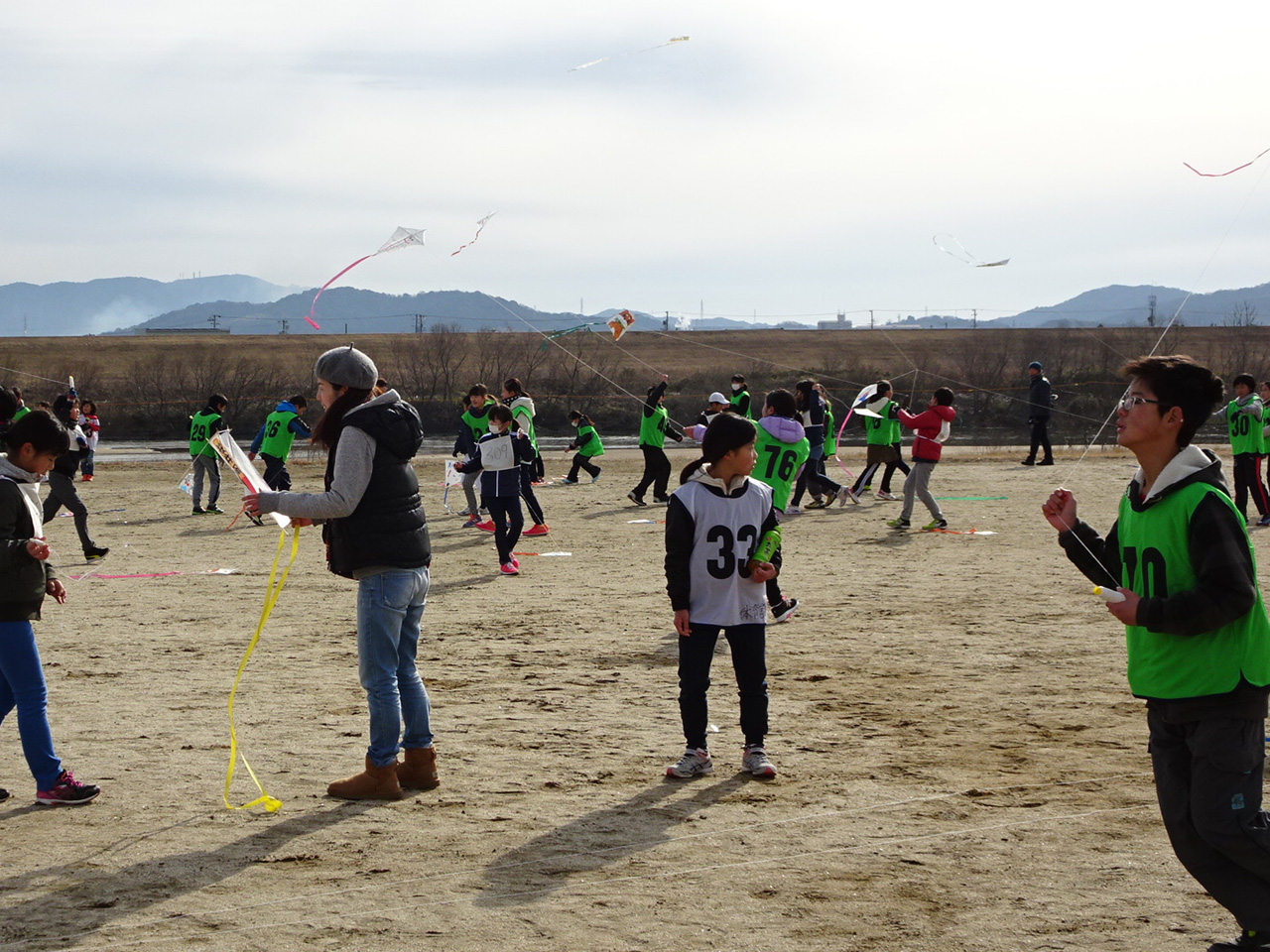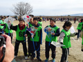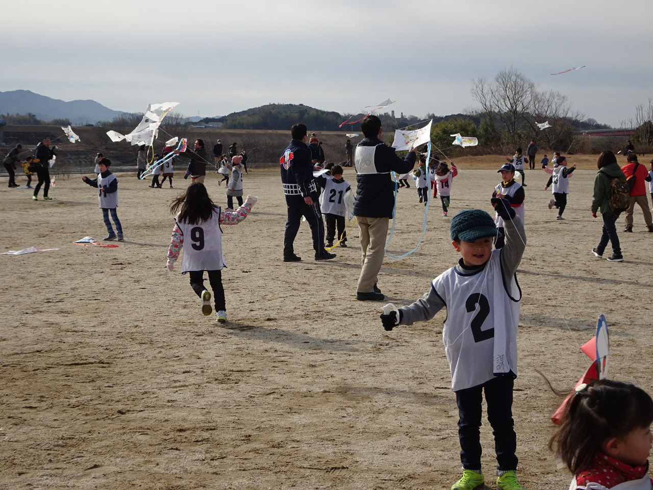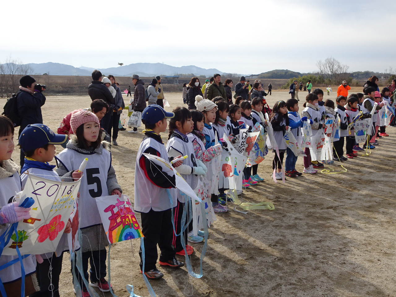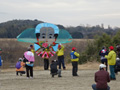 低学年の部、高学年の部、親子の部の大会。無風状態でしたが頑張って自作凧を揚げました。 |