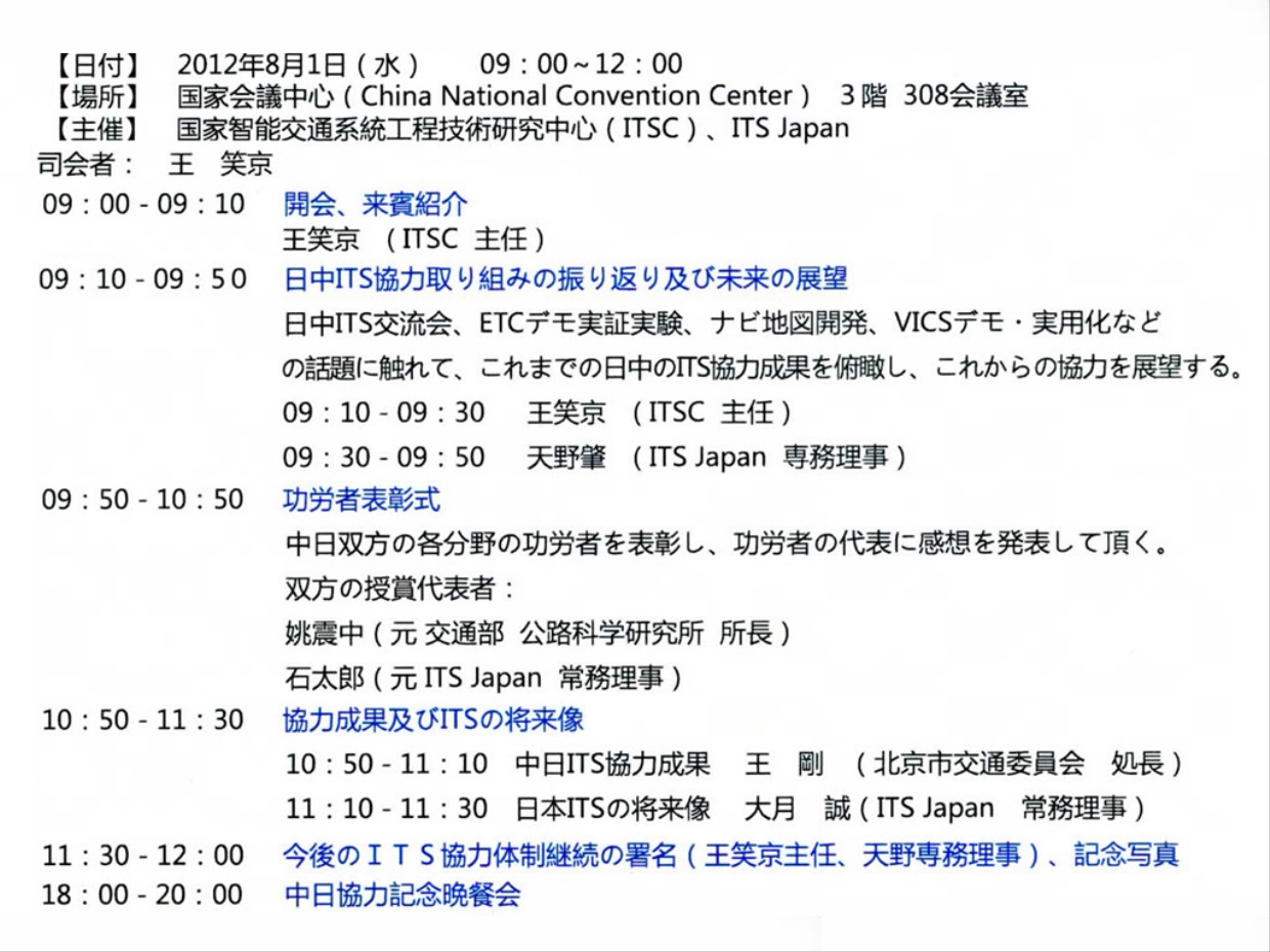 [8/01北京] 中国から中国ITS貢献者として招待され、2012智能運輸大会(中日ITSセミナー)へ出席。その後で中日協力記念晩餐会出席。