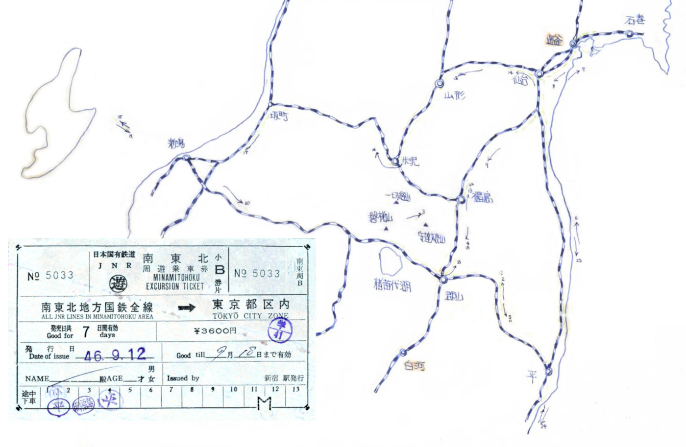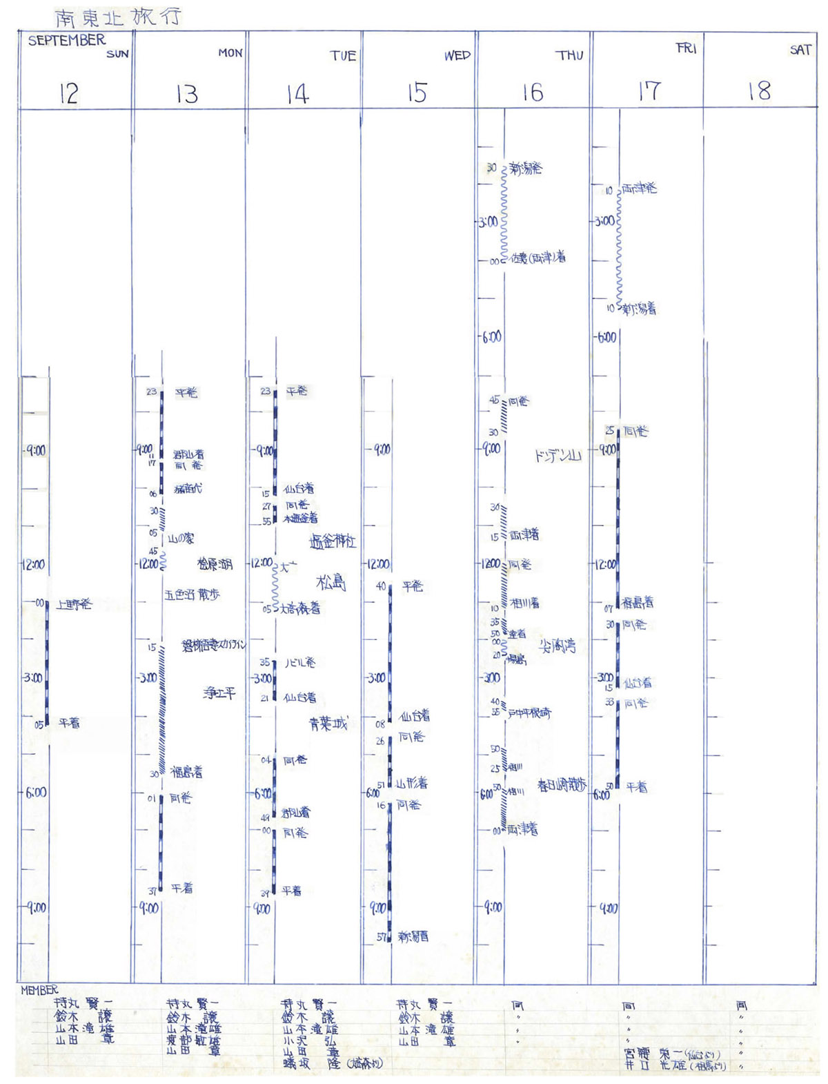 1971.9.12-18 南東北周遊旅行 1日目ひらい市の渡部君宅をベースキャンプにし、明大オケ有志でJR周遊券を最大限活用した旅行を決行。2日目は、磐梯山頂北側の桧原湖から数十の湖沼群がある五色沼を散策し、磐梯吾妻スカイラインを辿り浄土平を観光。