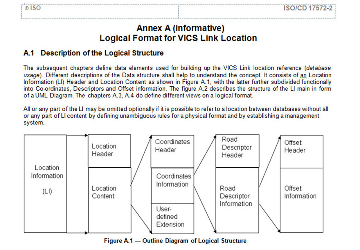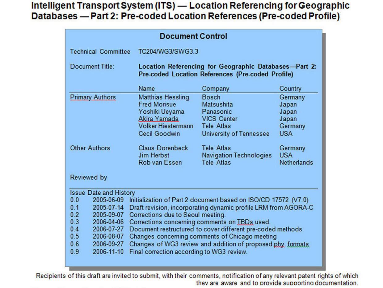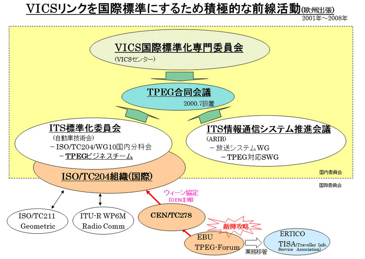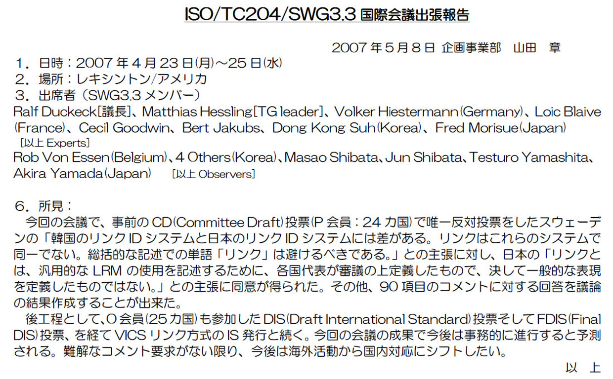 ・「VICSリンク位置参照方式」は、8年間の国際標準活動が実り、2006年10月アムステルダム国際会議でWD承認され、2007年02月にCD承認(24カ国が賛成)された。その後2008年11月05日に FDIS(Final DIS)承認を経てISとなった。 |