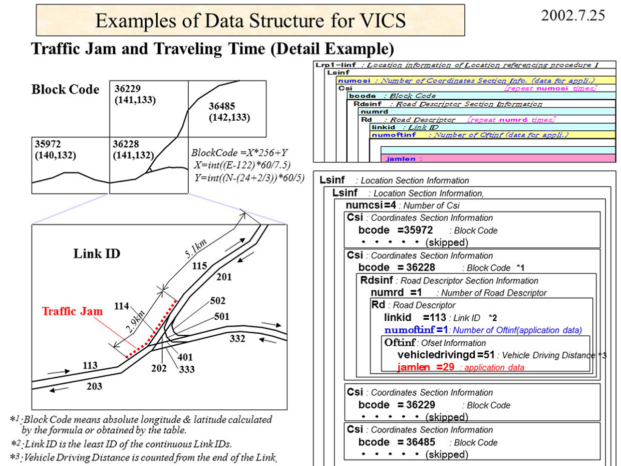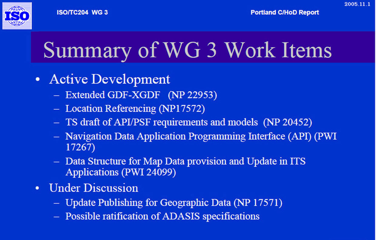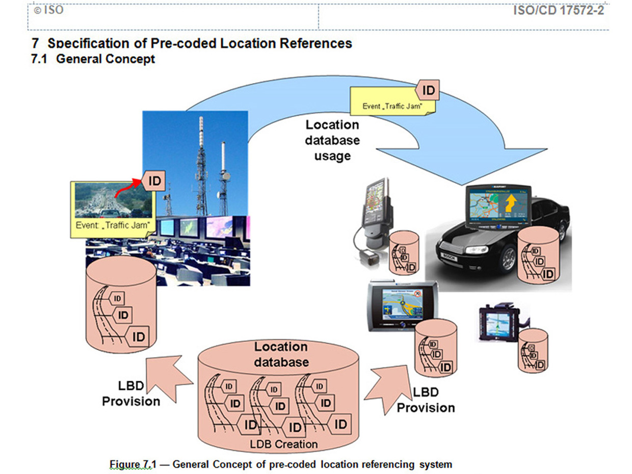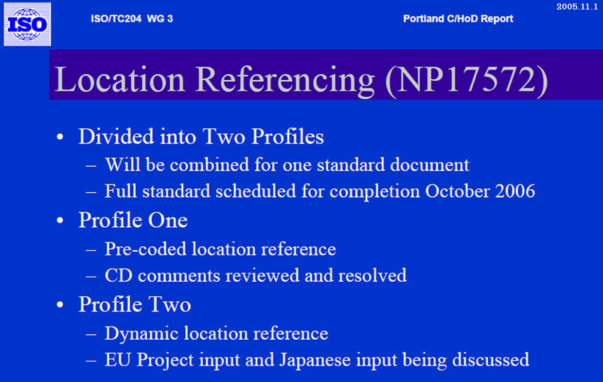 ・「VICSリンク位置参照方式」は、8年間の国際標準活動が実り、2006年10月アムステルダム国際会議でWD承認され、2007年02月にCD承認(24カ国が賛成)された。その後2008年11月05日に FDIS(Final DIS)承認を経てISとなった。 |