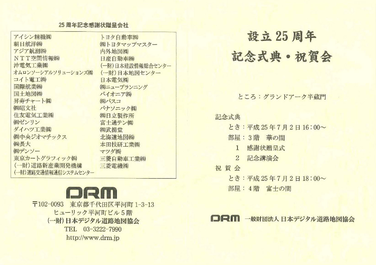 2013.07.02 日本デジタル道路地図協会 設立25周年式典 私が担当している、VICSリンク国際標準化や次世代VICSリンク方式でお世話になった方々にお会いできました。 | |||||