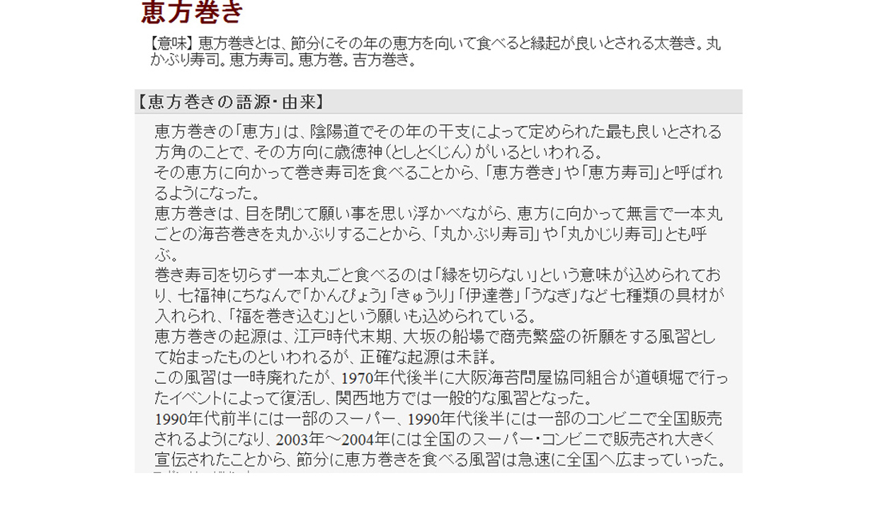 スーパーマーケットで恵方巻きを買って食べました。しかし、余りにもその語源・由来や方角の事が分かっていなかったのでまとめました。